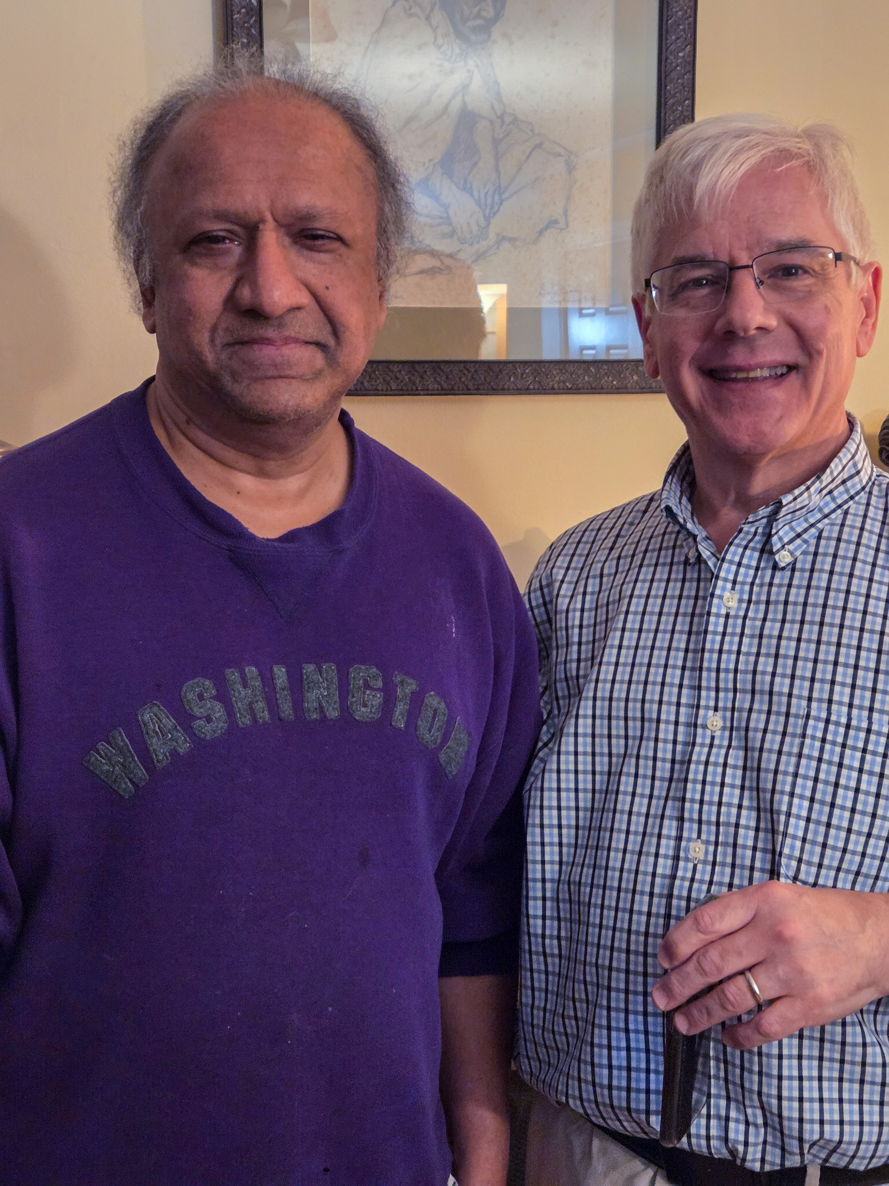 I was recently regaled by the arrival of two different guests to this fair city. The first was Steven J. Mariconda, whom I have known for a total of forty-three years (since 1983). Over several days we had nonstop yakking sessions, and I showed him my personal library (including the books in my shed in the back yard) while Mary cooked a toothsome chicken dinner for us. (She wanted to make a salmon dish, but Steve informed us of his Lovecraftian aversion to seafood.) On one day I took Steve on a miniature tour of the city—the University of Washington campus (including the Suzzallo-Allen Library, where I do so much of my research these days), the three houses I’ve lived in prior to this one (actually I’ve lived in four previous houses, the fourth being my former mother-in-law’s house; but I didn’t take Steve to that edifice), and other points of interest from a Joshian perspective. Here is a photograph of the two ageing scholars: